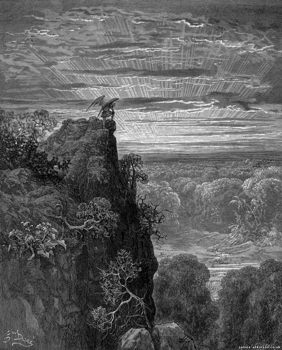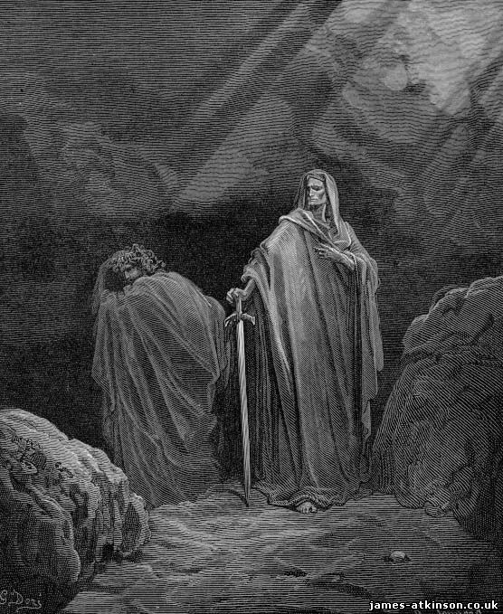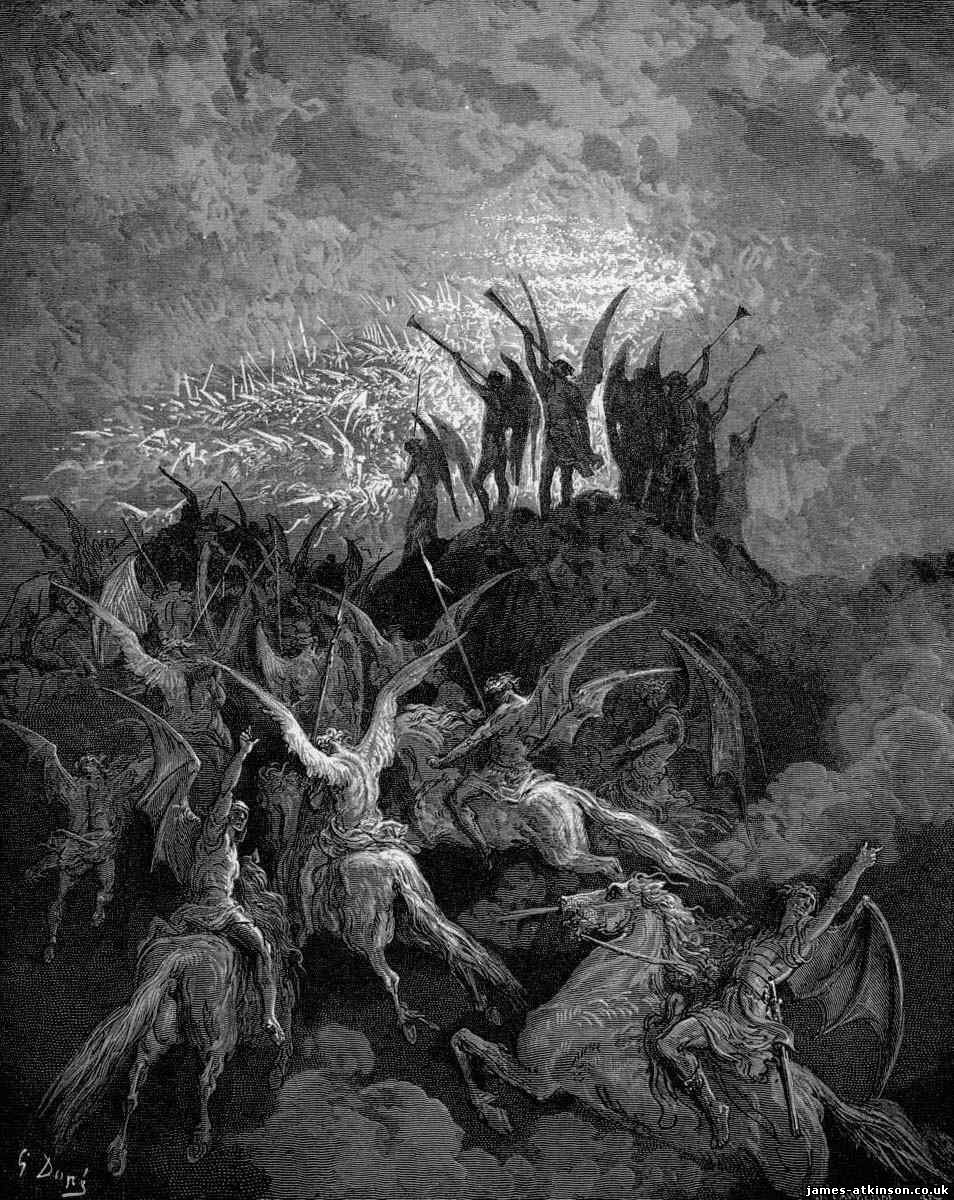 Uriel, an angel, is tricked into directing Satan to the home of man. This is where he finds the Garden of Eden. Adam and Eve are there and Satan becomes jealous of them. At that time Uriel warns Gabriel and his angels and they cast Satan from Paradise. The angel Raphael is sent by God to warn Adam and Eve of Satan and his plans. He then explains to them how Satan was once a favored angel but jealousy of God’s son led him to wage a battle in heaven. Raphael continues telling them how Satan and his followers were cast out and the earth was designed in order to one day replace all the fallen angels in heaven with mankind. Uriel reports the approach of Satan to the sentry angels at the entrance to Paradise (Gustave Doré)
